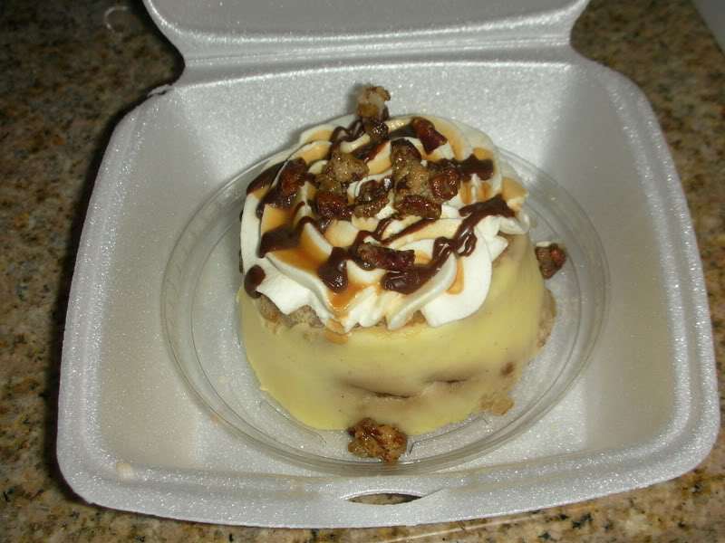 - Pull out frozen and top with whipped cream, sugared pecan nuts, caramel sauce, and chocolate sauce.