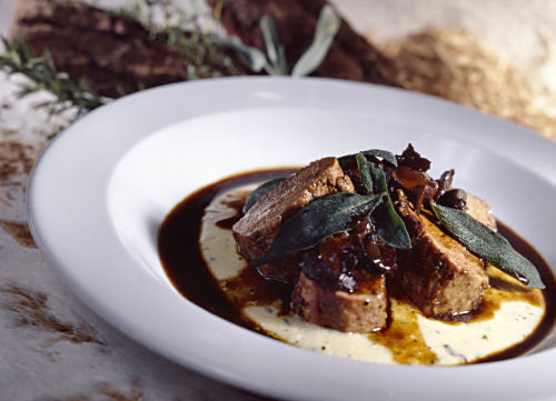 To serve, place a cup of polenta on each plate. Slice the tenderloins into thick coins and place five coins in the center of the polenta. Ladle the balsamic mushroom sauce over the coins and top with a few leaves of sage or parsley.